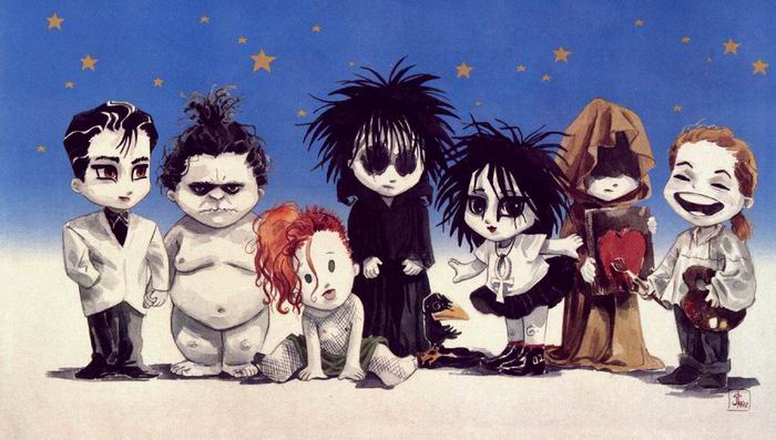 R: Gracias. Es una de las mejores cosas que he hecho con Sandman. En mi primer número para Vidas Breves Abel le está contando una historia a Daniel y Gaiman quería que los dibujara basándome en los personajes de Sal y Pimienta (Sugar and Spike), que son de las cosas más b0nitas que se hayan dibujado. Y pensé «¡Oh no! Es demasiado bonito» así que pensé en los personajes manga, cuando los hacen de tipo chibi, muy pequeños con pequeñas caras en una cabeza muy grande. Me dijo: «Cuanto más grande la cabeza y más pequeña la cara más bonitos parecerán» Y todo quedó genial y es probablemente una de las cosas más populares que haya hecho jamás. Después de eso dibujé al resto de la familia de ese modo.., Y así es, ¡fue una muy buena idea! Estoy orgullosa de haber expandido ese universo. Pero volviendo a Muerte. Mi interpretación partía de una melena suelta, delgada, pálida… pero hay que tener en cuenta quién es, está contigo en el último momento de tu vida, así que tenía que tener un punto de belleza, porque es una mujer que viene a confortarte. Así que si hablamos de los EEUU de los años cincuenta llevaría una falda larga, coleta, botas con calaveritas… Pero si nos vamos a los 70 tendría que ser muy disco con el pelo suelto. Me gusta hacer eso. A veces cuando me piden dibujos los fans es lo que hago, les pregunto que si quieren algún tipo específico y si me dicen que lo que se me ocurra a veces hago una Muerte italiana o una japonesa o una africana… Cojo el concepto y lo traslado a lo que haga falta. Es muy divertido.