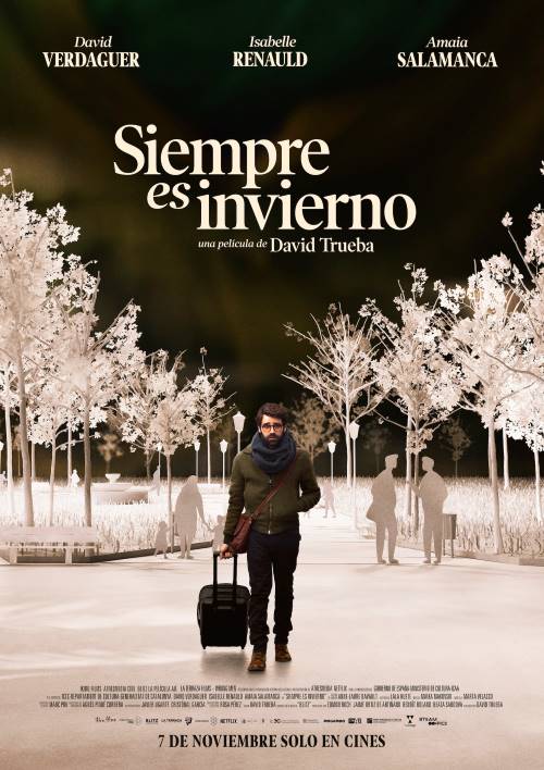 Trueba por Trueba → Siempre es invierno, la nueva película de David Trueba, presenta su cartel oficial y fija su fecha de estreno para el 7 de noviembre. Protagonizada por David Verdaguer, a quien David Trueba dirige de nuevo tras Saben Aquell, Siempre es invierno es la adaptación de la novela Blitz, escrita por el propio autor y publicada hace diez años por la editorial Anagrama. Es, además, la primera novela de Trueba llevada al cine. Además de Verdaguer conforman el reparto principal la francesa Isabelle Renauld, Amaia Salamanca, Jon Arias, Vito Sanz y Carla Nieto.