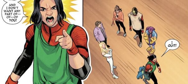 ¿Que quizás Kate Pryde debería haber contado a sus alumnos la verdad sobre lo que ocurrió con su vida después de los catastróficos hechos de la Masacre Mutante? Sí y mil veces sí. Sobre todo porque me parece lo más razonable (en los primeros compases de este cómic) si estás intentando quitarte de encima a los chavales que se han empeñado en adoptarte como mentora… Y sobre todo si se supone que este pasado te está marcando de una manera dolorosa. ¿Que Eve L. Ewing en ningún momento de esta entrega permite que la mutante se explique delante de sus alumnos? Pues también es verdad. Hemos de suponer que Bobby les cuenta a Bronce y la verdad detrás de la espiral de violencia de su amiga por separado y fuera de cámara. Pero lo cierto es que Meleé, que es la que acapara el protagonismo de esta Excepcional Patrulla-X #5, en ningún instante trata de descubrir qué fue lo que pasó: ni cuando se enfada hasta el punto de abandonar la Patrulla-X ni cuando regresa dispuesta a perdonar a su mentora por algo que se queda una vez más como el gran tema a tratar de la psique de esta heroína.
