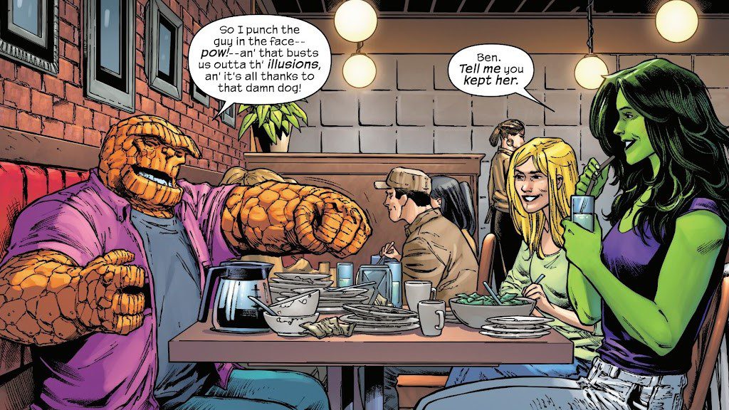 Así, llegamos al segundo punto. Este es un relato protagonizado por Ben, Sue (que repite del número anterior) y Hulka, miembro honorario de la primera familia. Entre los tres se enfrentan al problema de turno y lo resuelven. Como siempre. La imagen de Muerte es omnipresente, pero él no es omnisciente. Su presencia, por más que condicione el contexto general, no limita la capacidad de acción de nuestros protagonistas, que pueden seguir protagonizando el mismo tipo de aventuras que hasta ahora.