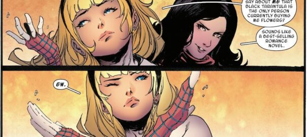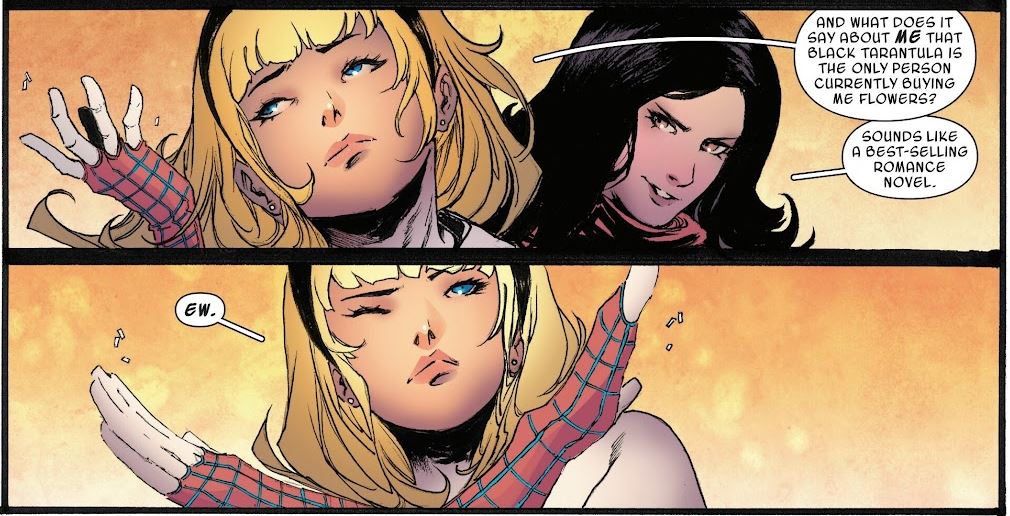 Y decimos que avanza lo justo porque si bien aparecen nuevos misterios y se resuelven otros, el interés principal radica en explicar las motivaciones de la nueva Tarántula Negra para hacer lo que hace y para entender el porqué de su interés es Spider-Gwen. Que la portada de Mark Brooks no os lleve a engaño, no hablamos de interés amoroso (aunque cierta atracción con potencial romántico sí que hay), sino de la cualidad única de Gwen en Tierra-616: es un «fantasma» para el sistema.