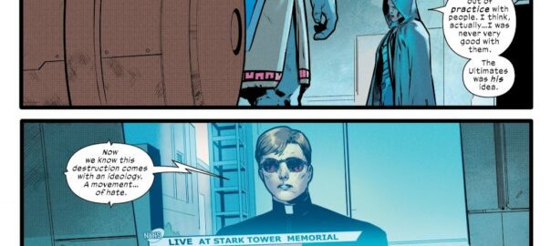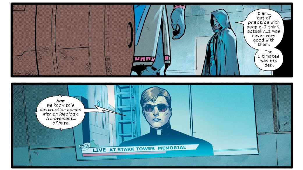 El dramático desenlace del tomo anterior «obliga» a que el arranque de este se dedique a explorar las consecuencias del mismo, que no son nada baladí, pues la ausencia de Tony Stark, precursor del súper grupo, genera dudas sobre sus compañeros y les impele a tomar la determinación de seguir adelante o dar un paso a un lado. Conocidos los roles que han ido desempeñando los Ultimates desde el inicio de la serie, ya podéis imaginar quiénes dan un paso al frente sin vacilar y quiénes se cuestionan la misión que han aceptado.