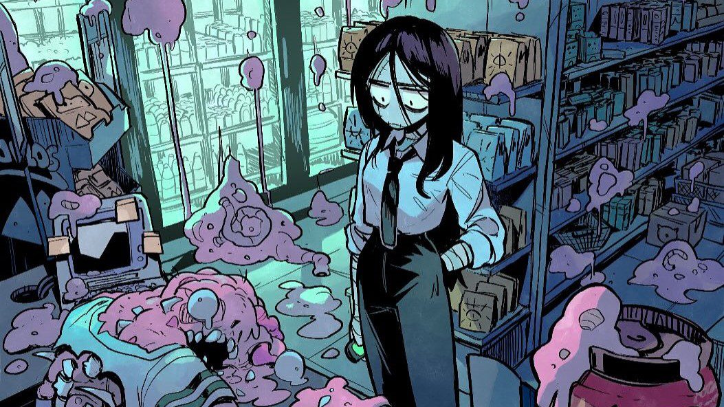En el cómic co-creado por Fernando Llor y Carles Dalmau (que es uno de los artistas de Cult of the Lamb) cabe de todo: desde alienígenas a zombis (como Vega, la protagonista), homenajes al «maldito» Hotel Overlook, personajes hechos de globos o criptobros. En el mundo de Brain Rot cabe de todo. Una mezcla imposible de códigos y realidades de las que Dalmau saca provecho con su característico estilo cartoon. Un dibujo de trazo aparentemente sencillo y de una expresividad tremenda, como bien ilustra el diseño de McCoy, compañero de Vera y segundo personaje en importancia.