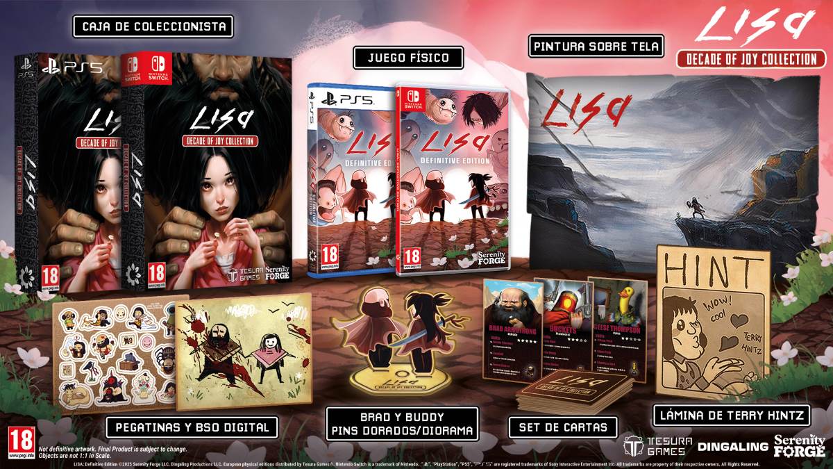 Lisa: Definitive Edition (que cuenta con textos en castellano) puede jugarse tanto en digital (edita Serenity Forge) como en formato físico en dos ediciones: Estándar y Coleccionista (Decade of Joy Collection), para PlayStation 5 y Switch desde el 25 de abril.